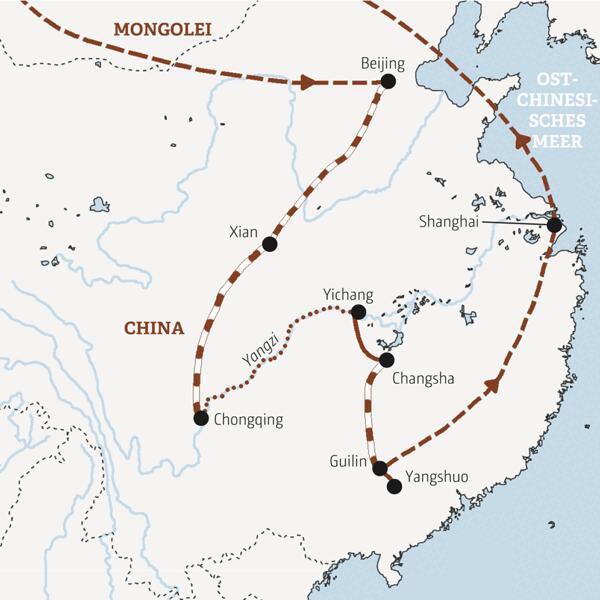 Best of China: Durchs Reich der Mitte von der Hauptstadt ins Herz des Landes und weiter. Von Beijing nach Xian – ans Ende der Seidenstraße. Über den Yangzi, auf Flusskreuzfahrt, in die Zukunftsmetropole schlechthin - Shanghai. In weiter Ferne, so nah: Wir stehen Auge in Auge mit Terrakotta-Soldaten, sind umgeben von futuristischer Architektur und wagen den Schärfetest der Hunan-Küche. Wir brausen in Hochgeschwindigkeitszügen und gleiten auf dem Li-Fluss. Eine Reise voller Highlights und besonderer Erlebnisse, Gänsehaut und Entspannung, gemeinsamer Abenteuer und eigener Entdeckungen.