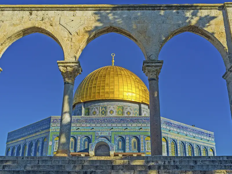 Die goldene Kuppel des Felsendoms glitzert uns im Morgenlicht auf dem Tempelberg entgegen. Gläubige beten hier und an der Al-Aksa-Moschee (beides Außenbesichtigung, abhängig von der Sicherheitslage). Vom Ölberg vormittags eine buchstäbliche Skyline: über Kirchtürme und Minarette bis zur goldenen Kuppel des Felsendoms. Dann hinter die Mauer, die Israel von Palästina trennt. Eine neue Perspektive: Eine christlich-palästinensische Familie zeigt uns Bethlehem inklusive Geburtskirche und erzählt beim Mittagessen vom schwierigen Miteinander der Völker.