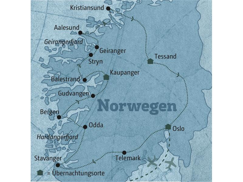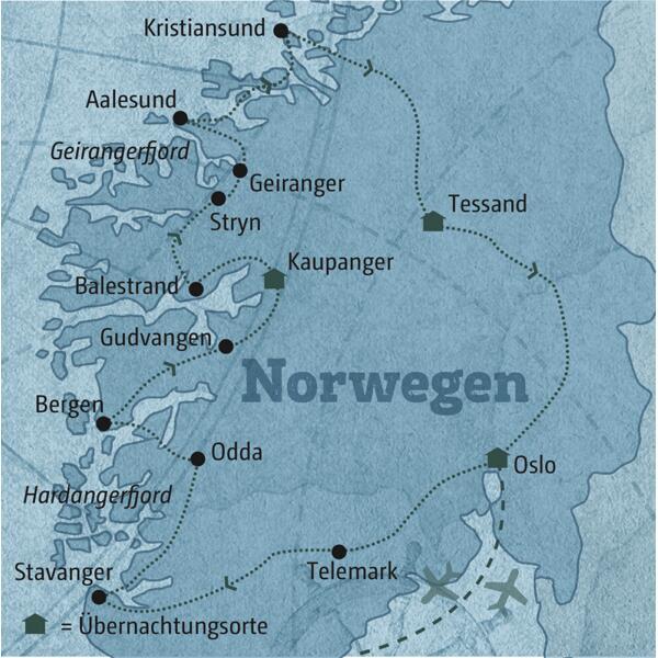 Die Idee dieser Reise: Machen Sie einen Roadtrip mit dem Mietwagen durch Norwegens südliche Hälfte. Auf Ihrer Route liegen die Städte Oslo, Stavanger und Bergen sowie unzählige landschaftliche Highlights, darunter die Telemark, der Hardanger- und der Geirangerfjord oder der Rondane-Nationalpark.