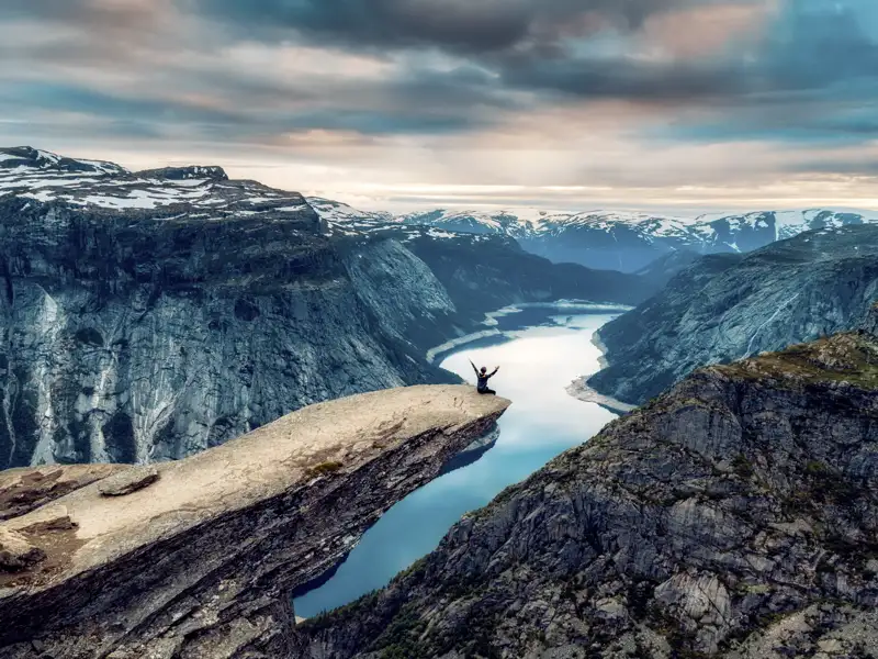 Die nächsten zwei Tage verbringen Sie am Hardangerfjord, dem zweitlängsten Fjord Norwegens. Unternehmen Sie atemberaubende Tagesausflüge, z. B. über die Norwegische Landschaftsroute Hardangervidda zum Vöringsfossen oder in den Folgefonna-Nationalpark. Im Sommerskigebiet können Sie Ski oder Steigeisen anschnallen und einen Guide auf einer Gletscherwanderung begleiten. Die Wanderung zur Trolltunga, zum spektakulären Felsvorsprung etwa 1100 m über dem Meeresspiegel, gehört zu den fantastischsten Wanderungen.