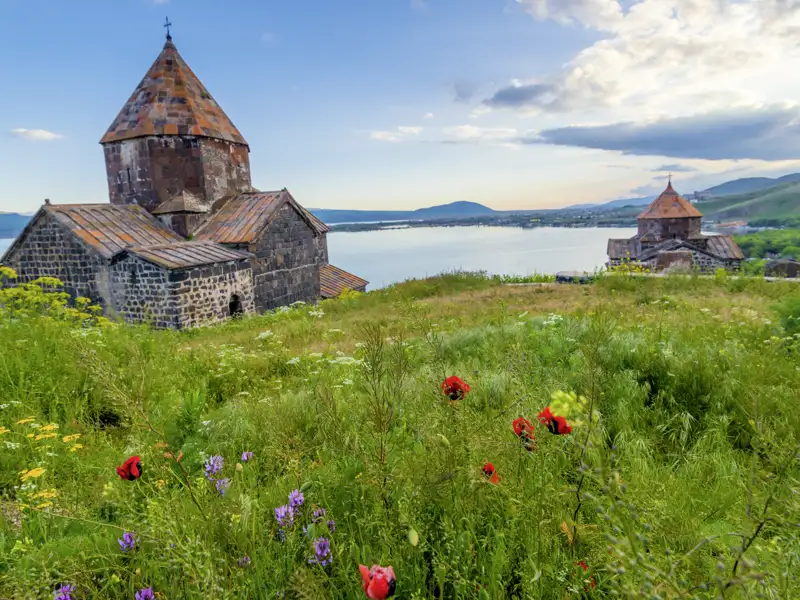 Nach dem Frühstück bleibt noch Zeit, Eriwan auf eigene Faust zu erkunden. Danach geht es auf zum Sewansee! Steinplatten führen uns zum Sewankloster am Ende einer schmalen Landzunge. Auf der Busfahrt Richtung Norden ein fast irreales Erlebnis: Nach einem Tunnel geht es aus den kargen Bergen des Hochlands in die üppig grünen Gebirgswälder des Kleinen Kaukasus. Dann Mittagsimbiss bei einer Familie in Dilijan. Sie empfängt uns herzlich und tischt lokale Köstlichkeiten auf. Zwei Übernachtungen in Alaverdi.