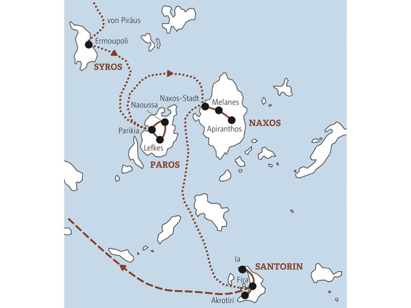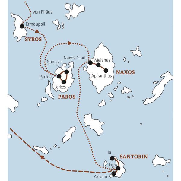 Reif für die Insel? Die Kykladen liefern griechisches Inselflair pur. Entdecken Sie Syros, Paros, Naxos und Santorin! Freuen Sie sich auf ursprüngliche Bergdörfer, Tavernen, Fischerhäfen und spektakuläre Vulkanlandschaften. Dazu grandiose Sonnenuntergänge und herrliche Strände. Bei leichten Wanderungen und einem Barfußpicknick im Sand kommen wir dem Inselleben nah, besuchen einen Töpfer, probieren den Insellikör. Ein Tanzkurs schenkt uns südländische Lebenslust. Der perfekte Urlaubsmix!