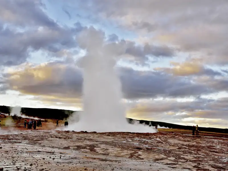 Tagestrip zum sogenannten Golden Circle. Im Graben des heutigen Nationalparks Thingvellir sehen Sie das Auseinanderdriften der amerikanischen und der europäischen Kontinentalplatten wie an keinem anderen Ort der Welt. Ausbrüche von Geysiren im Minutentakt erwarten Sie im Thermalfeld Haukadalur. Als Niagarafälle Islands bezeichnen viele den Gullfoss, den goldenen Wasserfall.