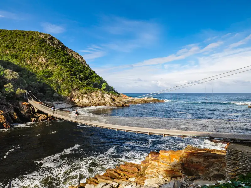 Hinein in die tropisch-wilde Landschaft des Tsitsikamma-Nationalparks. Wir spazieren zur abenteuerlich langen Hängebrücke, die sich über die Mündung des Storms River schwingt. Tief Luft holen! Dann balancieren wir hinüber. Der Blick schweift weit über den Ozean, krallt sich an Baumriesen fest, verhakt sich in schroffen Felsen. Mittags wartet bei Ingrid eine süße Belohnung für unseren Mut. Am Nachmittag fahren wir zu unserem Hotel in Wilderness. Unterwegs schauen wir in Knysna vorbei, schlendern über die Hafenpromenade, stöbern in Schmuck- und Souvenirläden und schauen den Booten beim Schaukeln zu. Zwei Übernachtungen in Wilderness.